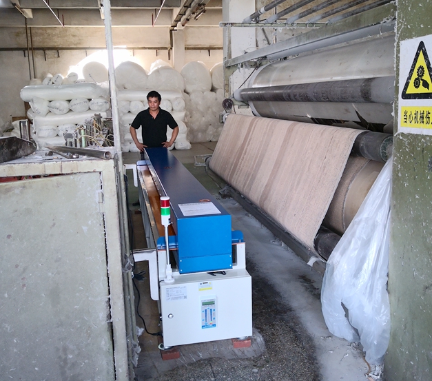 安装好后的宽幅龙门式检针机,立马就找出了很多细小的金属屑。要求0.8mm时,真的可以检出很多铁锈铁屑。报警率很高的。因此我们给景威提出要求其在检针机前端加装磁铁。以减少可能掉入棉中的金属屑。