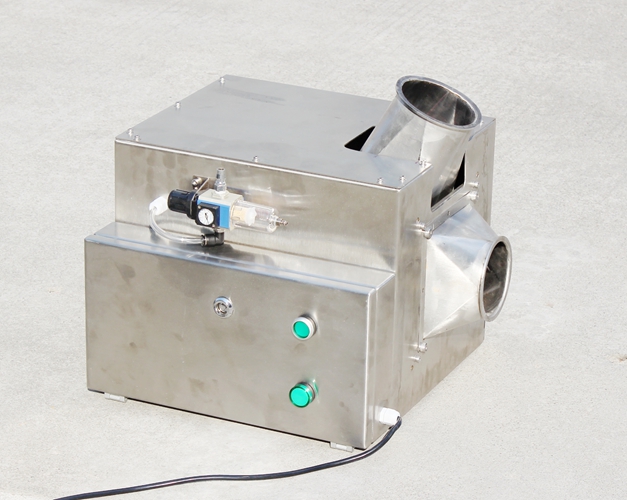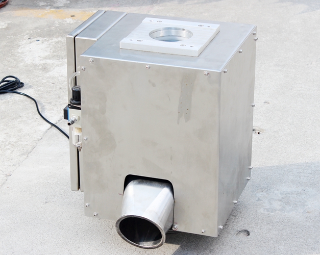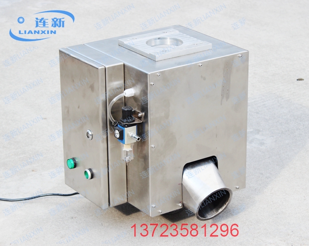 原料从料斗或送料器自由下落进入金属分离器,如果没有金属杂质,原料会直接通过金属分离器流向下端的出料口。如果检测器检测到原料中含有金属,那么控制器立刻启动分离板将金属物和部分原料一起导向侧面的排料口,然后分流板迅速恢复至正常的位置,分流板速度可调,金属分离器的检测精度也可根据生产需要调节,最小可检测并分离出Φ 0.2mm的金属颗粒。